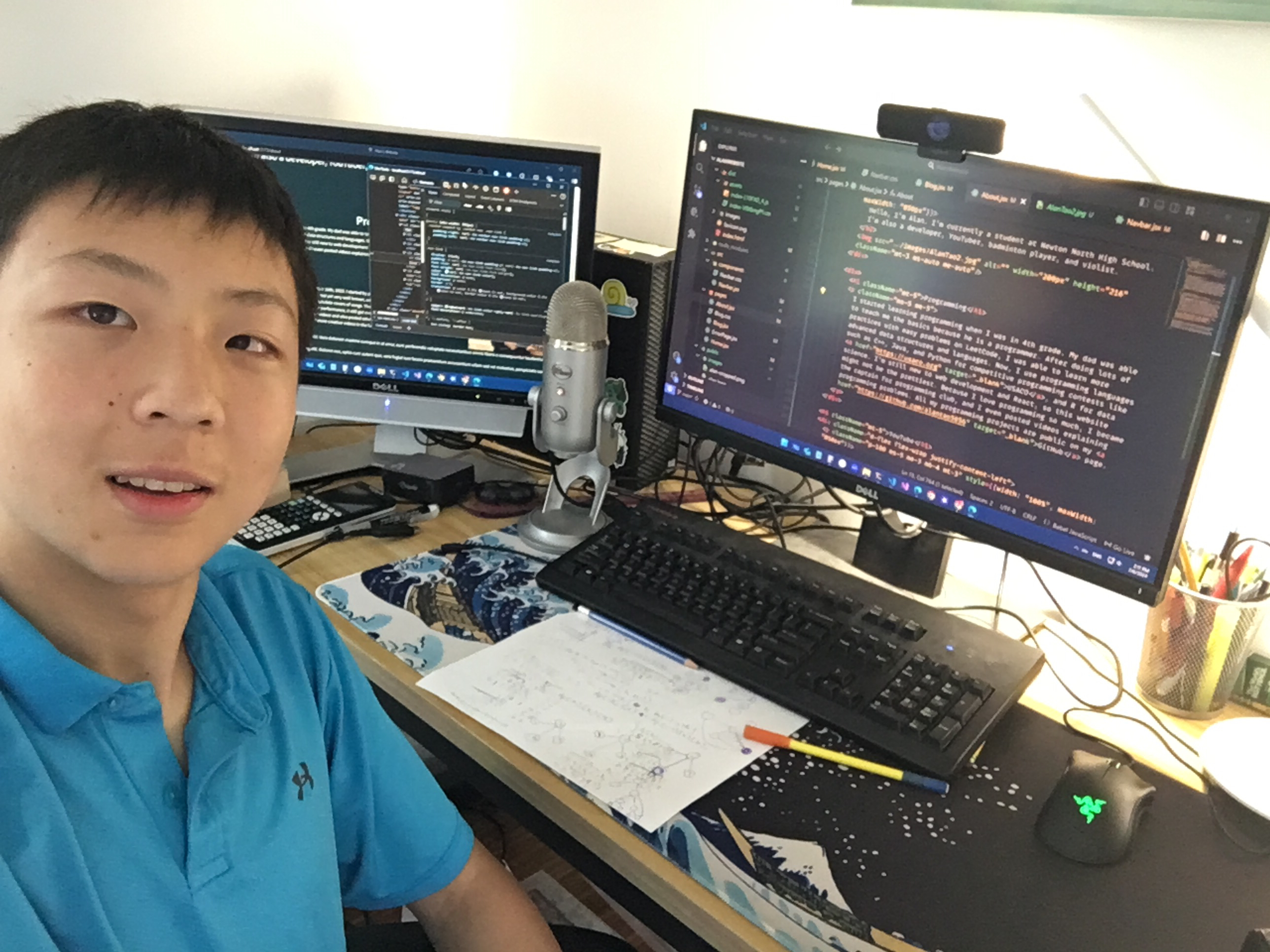I started learning the basics of programming from my dad when I was in 4th grade. After doing lots of practices with easy problems on LeetCode, I was able to learn more advanced data structures and languages. Now, I use programming languages such as C++, Java, and Python for competitive programming contests like USACO, R for data science, Q# for quantum computing, and swift for app development. I'm still relatively new to web development and React, so this website might not be the prettiest. Because I love programming so much, I became the captain for programming club and created a club website for us as well, and I even posted videos explaining programming problems. All my programming projects are public on my GitHub page.